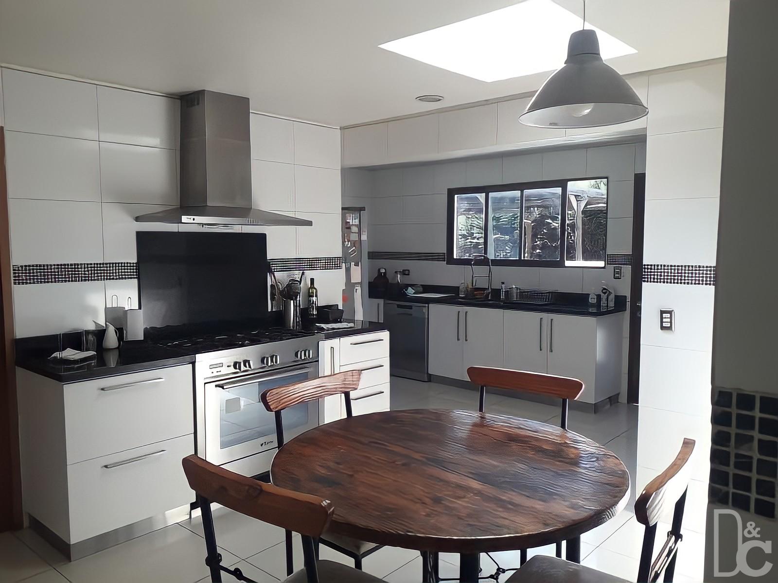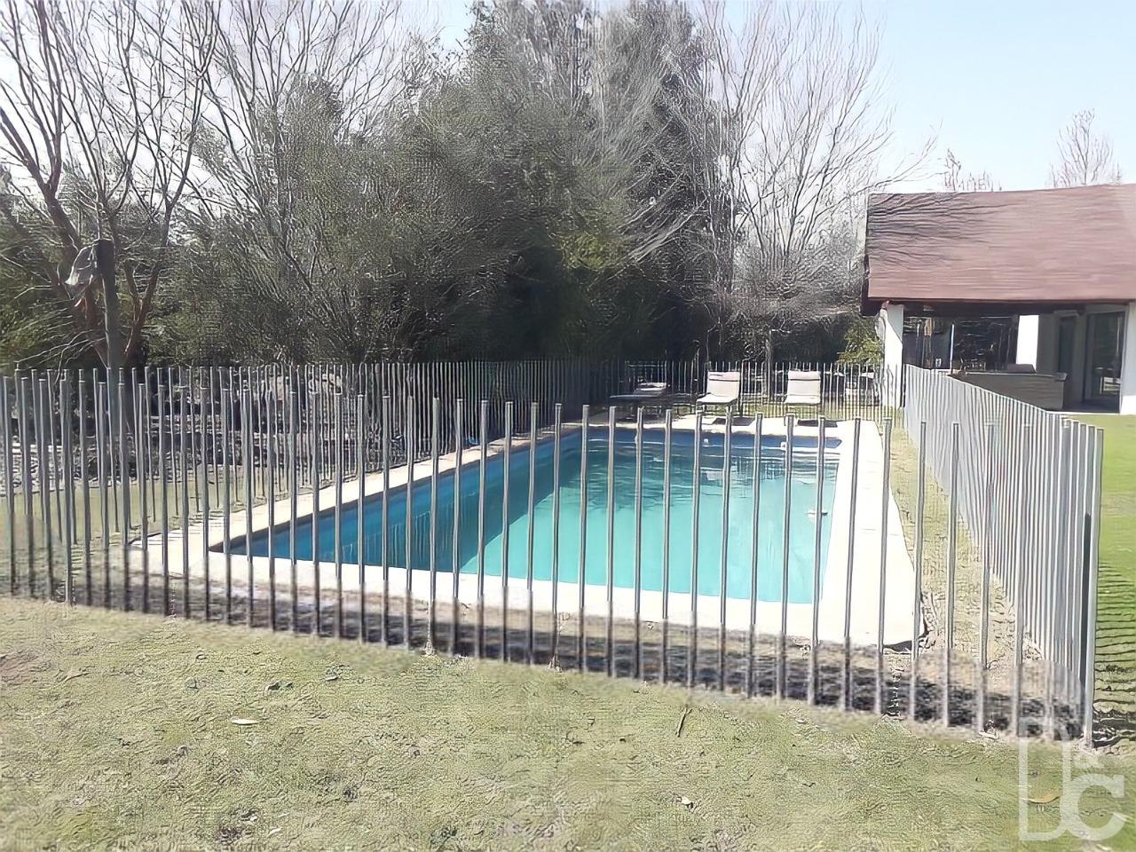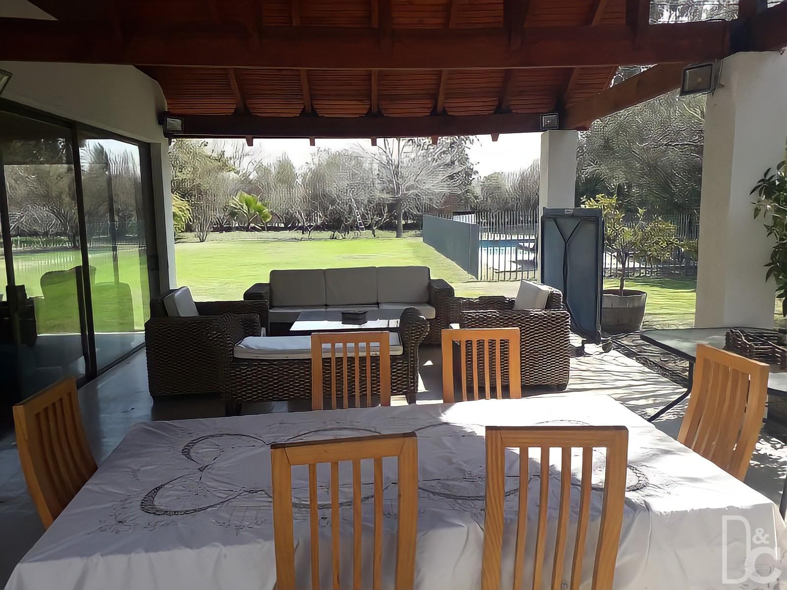 Gran Jardín formado por césped y riego automático, posee árboles frutales, piscina con protección y terraza, portón automático.